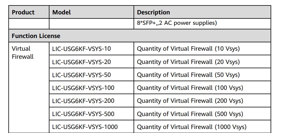 Spécifications de la fonction de pare-feu virtuel Huawei LIC-USG6KF-VSYS |